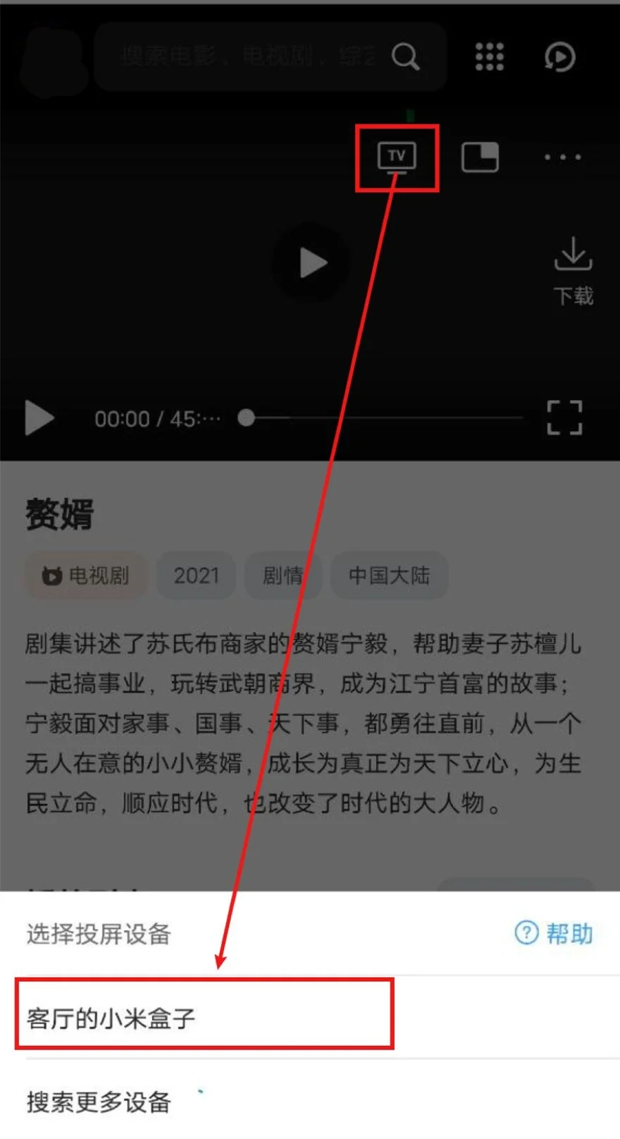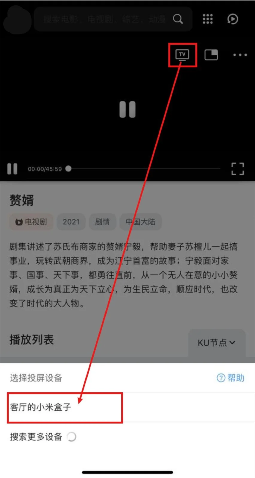 打开QQ浏览器(会接管网页播放器)->打开Bleki视频站->播放视频->选中投屏图标->等待搜寻出智能电视/电视盒子->选中,即可投屏。